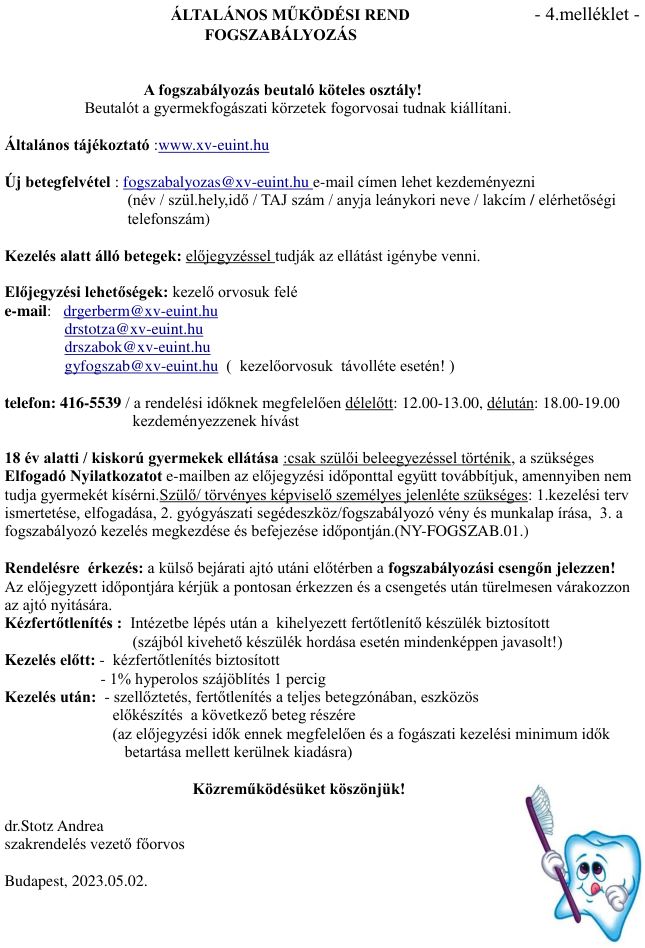 Új betegfelvétel: Kérjük írjon e-mailt a fogszabalyozas@xv-euint.hu címre. Olyan címet adjon meg amit rendszeresen néz, mert ez lesz a kapcsolattartási forma. Gyermek neve, születési helye, ideje, TAJ száma, anyja leánykori neve és lakcímkártyán szereplő lakóhely, elérhetőségi telefonszám is szükséges az előjegyzéshez.